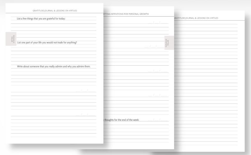 This book includes several types of writing and reflection exercises. Every week you will be introduced to a different concept of how to apply gratitude to your world. The reader/writer will get to know new definitions for familiar virtues and learn new virtues that are not as common in everyday conversation. You will learn how they interplay with complementary virtues and the negative traits you want to transcend.